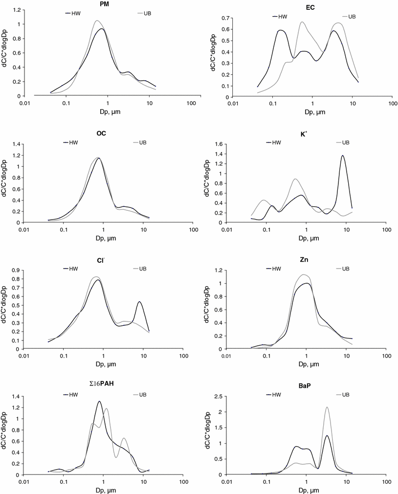The PM mass size distribution was bimodal at UB. At HW, in 6.8-10 µm, the third peak for its density function appeared. Also the maxima of the density functions for Na+, K+, Cl−, and Ca2+ occurred in this interval. The coarse ambient particles containing OC, EC, Na+, K+, Cl−, Ca2+, Al, Si, Fe, Cu, Zn, Mo are probably a mixture of the particles of worn tires, brake linings, chassis, other car parts, road surface, soil, etc. (Wahlin et al. 2006; Thorpe and Harrison 2008; Pant and Harrison 2013). Such particles, involved in the process of alternate lifting (by passing cars, wind, etc.) and deposition, can stay within the road vicinity for a long time.