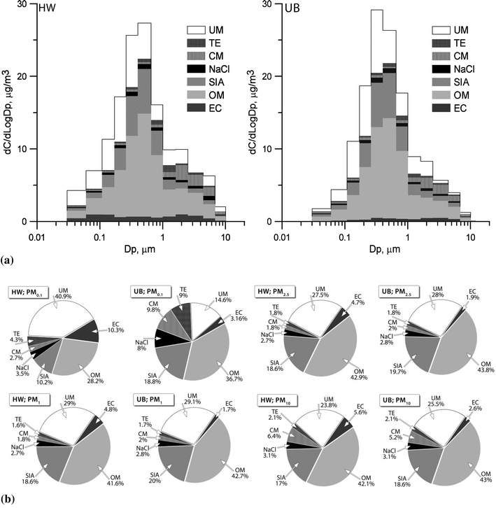 The shares of UM in twelve PM fractions were greater, and in ultrafine PM much greater, at HW than at UB (Fig. 3). At HW, the UM shares in PM0.06-0.65 and in particles with Dp > 10 µm were greatest; whereas at UB, they were greatest in PM0.108-0.65 and PM1.6-4.4. UM consists of the organic compounds and nitrates that evaporate during transportation and storage of PM samples, unidentified compounds, and water (Tsyro 2005). Also, inaccurate identification of compounds in OM, CM and TE affects UM. For example at HW, considering the high UM content of 12 fractions, [OM] should probably have been computed by multiplying [OC]A by a coefficient greater than 1.4 (Turpin and Lim 2001).