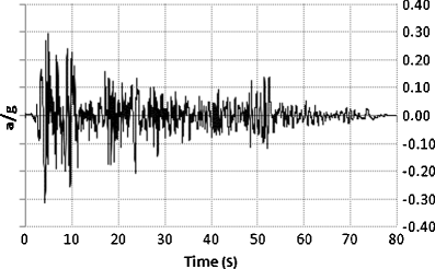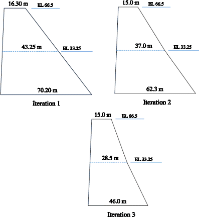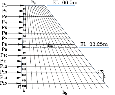 Shape optimization of two-dimensional structures under earthquake loading is studied here. The first case is a plane stress cantilever beam, and the second one is a plane strain concrete gravity dam. Vertical component of Kobe earthquake is used for the beam excitation, and horizontal component of El-Centro earthquake is applied for the dam excitation. Design variables in both cases are \(\mathbf {X}=\left \{ {\text {h}_{\text {c}} ,\text {h}_{\text {m}},\text {h}_{\text {b}}} \right \}\). Where h\(_{\mathrm {c}}\), h\(_{\mathrm {m}}\), h\(_{\mathrm {b}}\) are the widths of the structures at the reference points (two ends and middle), respectively.