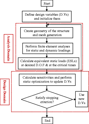 Cheng and Truman (1983) studied the optimization of the structures by modal response spectrum method. Truman and Petruska (1991) applied optimality criterion techniques for optimization of two-dimensional structures using time history analysis of seismic excitations. Although, the above researches are limited to seismic loads, the transformation is based on experimental codes, and it lacks generality. Choi et al. (2005) and Choi and Park (1999a, b) proposed several methods to find reliable equivalent static loads from dynamic loading. Two kinds of ESLs are considered in the literature: exact and approximate. Although, the location of the approximated ESLs should be pre-assumed in these methods, and the ESLs are calculated at some peaks of important locations (Kang et al. 2001). The pre-assumptions for load locations create different ESLs. It is difficult to choose the locations and to calculate the sensitivities of the ESLs with respect to the design variables.