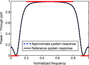 Once the component metamodels that predict the value for P L0 and L π for each coupler have been constructed, the following operations to evaluate the system objective are performed at system level. In order to evaluate the objective to be optimized, (32), the power coupling ratio of each coupler is needed. This operation is performed on system level since the value of P L0 and L π can cheaply be predicted by the Kriging metamodels for each coupler. The computation of the transfer function via scattering matrix analysis involves simple operations on small matrices and is therefore also performed on system level. Once the transfer function is known, it has to be plugged into (32) to find the system objective.