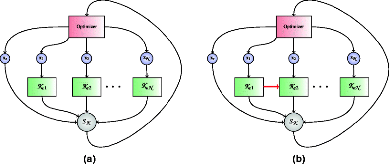 a shows the process of optimization of the system based on metamodels of the independent components is shown. In b, a type of problem in which dependence exists between the underlying components of the system is illustrated
