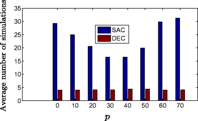 Comparison of the average number of simulations, based on 20 runs, needed by DEC and SAC to converge to the optimum of the problem. The horizontal axis is the value of the problem parameter p