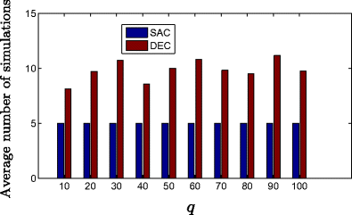 The average number of simulations, based on 20 runs, needed by DEC and SAC to converge to the optimum of the problem. The horizontal axis is the value of problem parameter q