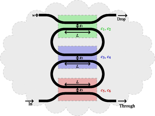 The system response, S, can be modeled in terms of two expensive components that are repeated three times in the second order resonator since each coupler requires two expensive simulations and there are three couplers in the system. Figure 9 shows the six components c 1 to c 6 as well as the five design variables of the problem [w g 1 g 2 g 3 L]. We treat the responses P L0 and L π , generated from each coupling section, as the components of the problem since this suits the mathematical structure of this problem. The expensive components are only a function of the width and the respective gaps. The components c 1, c 3 and c 5 give the power coupling ratio P L0 for each coupler while the beat length L π for each coupler is found by components c 2, c 4 and c 6.