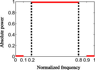 Desired band-pass filter spectral response (red line) of the serial ring resonator. No preference is specified in the intervals [0.1,0.2] and [0.8,0.9]