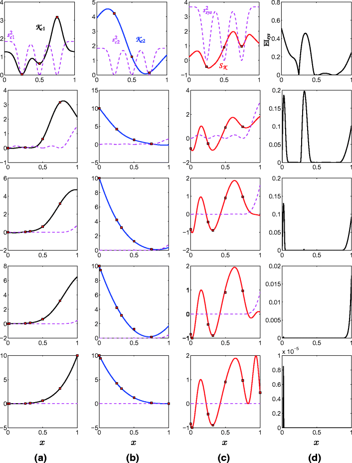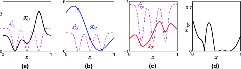 The Kriging metamodel of components c 1(x) and c 2(x) and the system response \(S_{\mathcal {K}}\) are plotted along with their respective error estimate in (a), (b) and (c). Plot (d) shows the system level expected improvement EI s y s