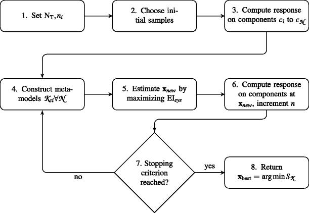 The aim of this work is to optimize (2) by means of building and iteratively improving a set of component metamodels such that the optimum of the original system problem, (1), is estimated. An additional goal is to solve system problems involving constraints. Changes required in the iterative sampling strategy to accommodate this goal are discussed in Section 3.3.