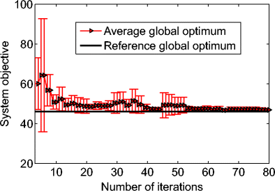 The mean performance of the 100 runs of the system level approach is compared against applying optimization on a Kriging metamodel of the original function in (28) which is constructed using 12 expensive simulations chosen via LHS. The Kriging metamodel is also constructed 100 times based on 100 different combinations of LHS samples and the mean performance is analyzed.
