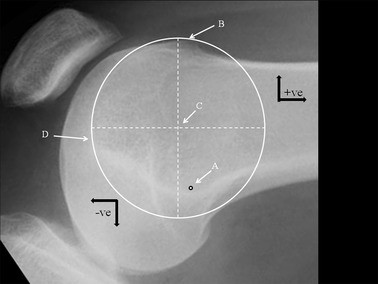 The radiographical analysis began by identifying the femoral tunnel position as defined by Schöttle [17] and marked ‘A’ (Fig. 1). Schöttle’s point lies just distal and anterior to a line drawn at right angles to an extension of the posterior femoral cortical line. The boss height was then measured [14], which is the distance between the extension of the anterior femoral cortical line and the right angle to the most anterior point of the groove. Using the ellipse tool available on the PACS program, and on the assumption that a dysplastic groove is an arc of a circle, a circle was created to match the groove. Circularity was confirmed by measuring and equalising the diameters at right angles. The centre of this circle was defined as the “isometric point” and marked ‘C’. The distance between A and C was measured and recorded. Using the anatomical axis (horizontal offset), the distance proximal (negative) and distal (positive) between A and C, and the right angle to this (vertical offset) were measured. The vertical offset was defined as positive if anterior and negative if posterior to the anatomical axis. No special scaling program was used to correct for any magnification errors and the results were measured in millimetres rounded to the nearest 0.5 mm. Two further measurements were taken, from point A to the most anterior point of the boss (B), and also from point A to the most distal point of the trochlea (D). The PFI cohort was further subdivided into those with a boss height < 5 mm and those whose boss height was ≥ 5 mm. A boss height of ≥ 5 mm has been defined as significant TD [6].