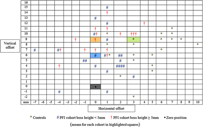 Figure 2 shows the scatter of the isometric points by cohort (controls, PFI with boss height < 5 mm, and PFI with boss height ≥ 5 mm).