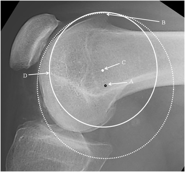 Lateral radiograph of the knee showing: Schöttle’s point: black rimmed spot (A). Isometric point: white spot (C). Dotted circle: centred on Schöttle’s point with the radius to the highest point of the boss (B). Complete circle: centred on the isometric point. Note that the dysplastic groove is not an arc of this circle. Point D is the distal end of the notch