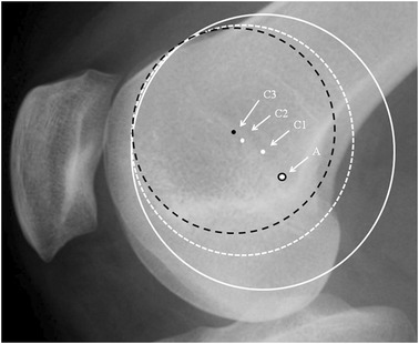 Lateral radiograph of the knee showing different circles depending on how the observer chooses the best circle-fit to the dysplastic trochlea curve: Schöttle’s point: black rimmed spot (A). Centres of white circles: white spot (C1) solid circle and (C2) dashed circle. Centre of black circle: black spot (C3)