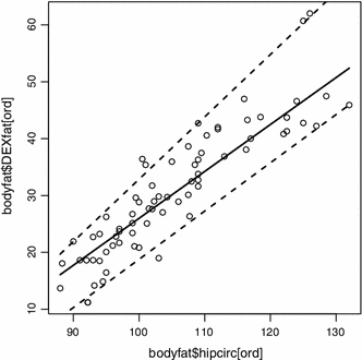 The resulting plot (see Fig. 12) shows how quantile regression can be used to get a better impression of the whole conditional distribution function in a regression setting. In this case, the upper and lower quantiles are not just parallel lines to the median regression line but adapt nicely to the slight heteroscedasticity found in this data example: For smaller values of hipcirc the range between the quantiles is smaller than for higher values. Note that the outer quantile-lines can be interpreted as prediction intervals for new observations (Meinshausen 2006; Mayr et al. 2012c). For more on quantile regression in the context of boosting we refer to Fenske et al. (2011).