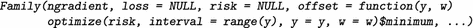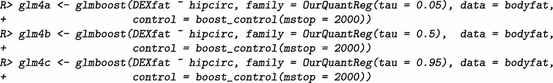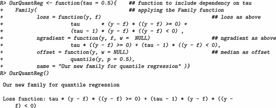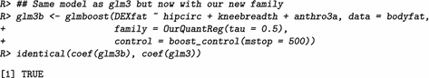 Of further interest is also the starting value for the algorithm, which is specified via the offset argument. For quantile regression it was demonstrated that the offset may be set to the median of the response (Fenske et al. 2011). With this information, we can already specify our new family for quantile regression: