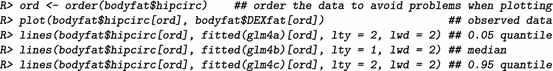 To get a better idea of the shape of the conditional distribution we model the median, and the 0.05 and 0.95 quantiles in a small, illustrative example containing only the predictor hipcirc: