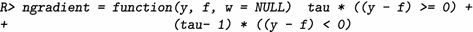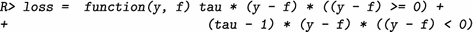 We will demonstrate the usage of this function by (re-) implementing the family to fit quantile regression (the pre-defined family is QuantReg()). In contrast to standard regression analysis, quantile regression (Koenker 2005) does not estimate the conditional expectation of the conditional distribution but the conditional quantiles. Estimation is carried out by minimizing the check function \(\rho _{\tau }(\cdot )\):