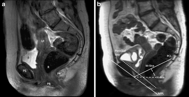 a Static T2-weighted turbo spin echo (TSE) at rest for anatomical reference in midsagital plane through the pelvis of a 66-year old woman with pelvic organ prolapse (POP) symptoms. The uterus (Ut), bladder (B), pubic symphysis (PS), rectum (R), puborectal muscle (PR), and perineal body (PB) are shown. b Dynamic midsagital half-Fourier-acquisition single-shot turbo spin-echo (HASTE) sequence during straining in the same patient. Reference lines: pubococcygeal line (PCL), H-line, perineal line, midpubic line (MPL), and M-line