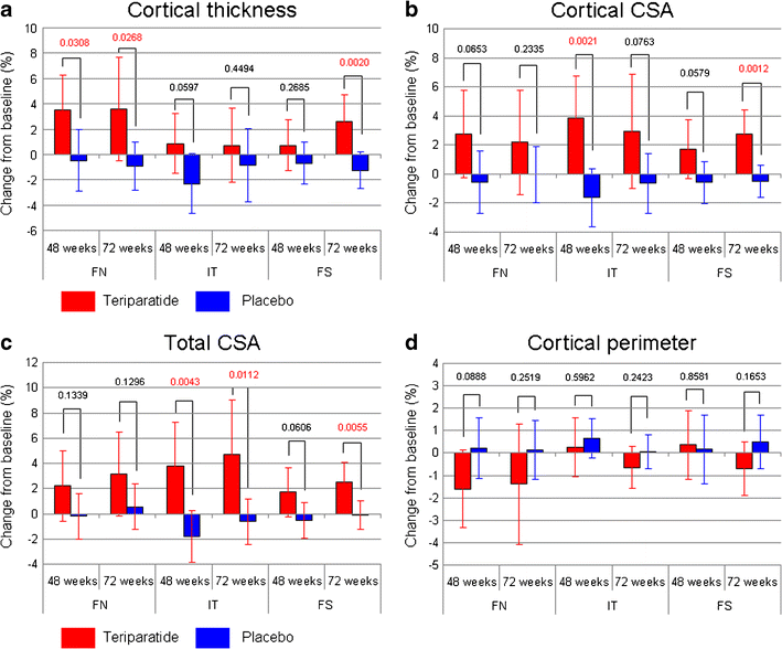 Mean percent changes and 95 % confidence interval from baseline in cortical thickness (a), cortical cross-sectional area (CSA) (b), total CSA (c), and cortical perimeter (d) at 48 and 72 weeks of treatment with teriparatide and placebo. Changes at the femoral neck (FN), inter-trochanter (IT), and femoral shaft (FS) are shown. Values on top of each panel indicate p values (between teriparatide and placebo group). Red and blue bars correspond to teriparatide and placebo groups, respectively. To compare the difference between the two groups, the percent changes from baseline in QCT parameters were analyzed using the Student’s t test