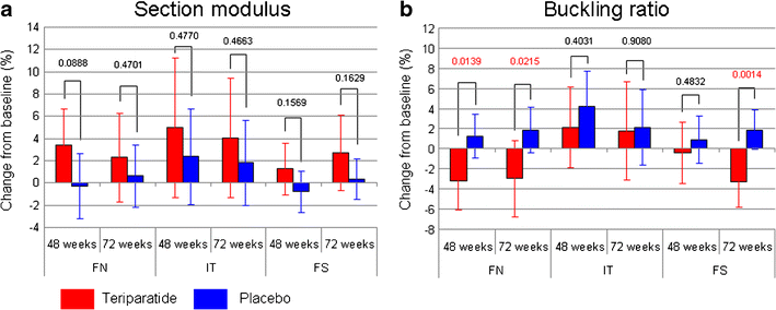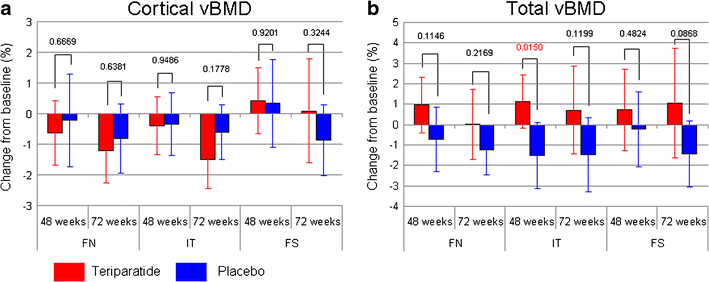 Mean percent changes and 95 % confidence interval from baseline in cortical volumetric bone mineral density (vBMD) (a) and total vBMD (b) at 48 and 72 weeks of treatment with teriparatide and placebo. Changes at the femoral neck (FN), inter-trochanter (IT), and femoral shaft (FS) are shown. Values on top of each panel indicate p values (between teriparatide and placebo group). Red and blue bars correspond to teriparatide and placebo groups, respectively. To compare the difference between the two groups, the percent changes from baseline in QCT parameters were analyzed using the Student’s t test