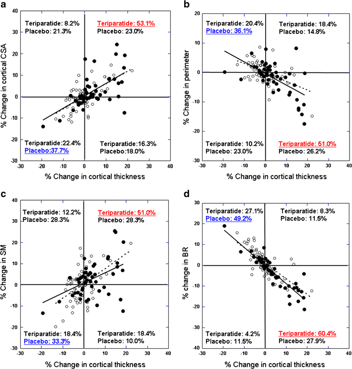Weekly administration of teriparatide reverses age-related changes at 72 weeks in cortical geometry and biomechanical properties at the femoral neck. Relationships between percent changes in cortical thickness versus those in cortical cross-sectional area (CSA) (a), perimeter (b), SM (c), or BR (d) are shown. Solid circles and open circles correspond to percent changes of individuals in the teriparatide and placebo groups, respectively. Note that linear regression lines for teriparatide (solid lines) and placebo (dashed lines) showing the relationship between the percent change in cortical thickness and those in other parameters, are almost identical regardless of whether the correlation is positive (a and c) or negative (b and d). The distribution of closed and open circles in each quadrant is shown in percentages. Note that with respect to the parameters with positive correlations (a and c), the relative distribution of open circles (for placebo) in the third quadrant is shifted to the first quadrant by weekly teriparatide (closed circles). Similarly, in the case of the parameters with negative correlations (b and d), relative distribution of open circles (for placebo) in the second quadrant is shifted to the fourth quadrant by weekly teriparatide (closed circles), suggesting that weekly teriparatide reversed age-related changes in proximal femur geometry and biomechanical properties