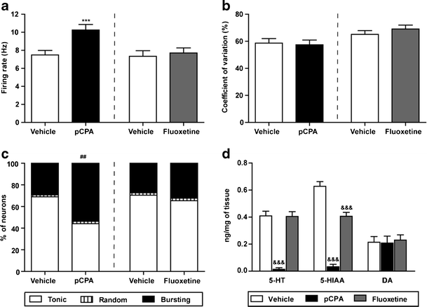 STN neuron electrophysiological parameters and 5-HT, 5-HIAA, and DA levels in the STN. Firing rate, coefficient of variation, and firing pattern (a, b, and c, respectively) of neurons recorded 24 h after the last vehicle, pCPA (300 mg/kg/day, i.p. 3 days) or fluoxetine (10 mg/kg/day, i.p. 14 days) injection; 86 neurons from 25 vehicle-control rats, 85 neurons from 16 pCPA-treated rats, 90 neurons from 16 vehicle-treated rats, and 130 neurons from 17 fluoxetine-treated rats. d Effect of pCPA (300 mg/kg/day, i.p., 3 days) and fluoxetine (10 mg/kg/day, i.p., 14 days) treatments on 5-HT, 5-HIAA, and DA levels in the STN, in control (n = 6), pCPA-treated (n = 5), and fluoxetine-treated (n = 6) animals. Each value represents the mean ± SEM. ***p < 0.001 vs. its control group (unpaired Student’s t test). ## p < 0.01 vs. its control group (Fisher’s exact test). &&&p < 0.001 vs. control group (Bonferroni’s post hoc test)