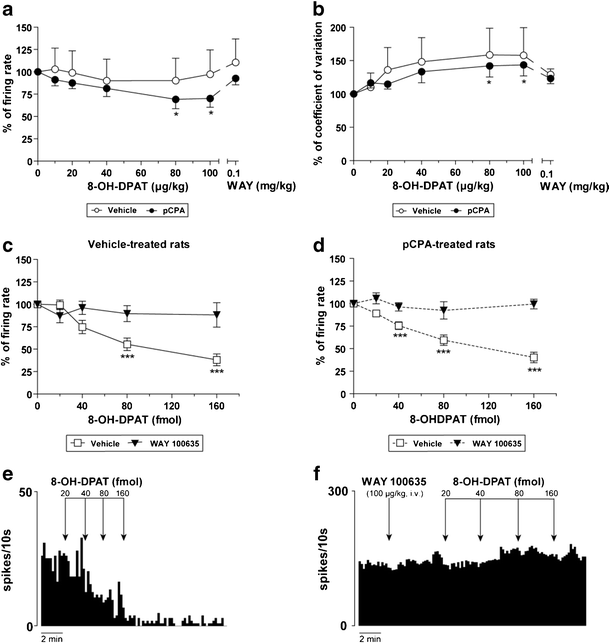 Effect of 8-OH-DPAT on STN neuron activity. 8-OH-DPAT (10–100 μg/kg, i.v.) induced an inhibition in the firing rate (a) and an increase in the coefficient of variation (b) in pCPA-treated (300 mg/kg/day, i.p. 3 days) rats (black circles; n = 8 neurons from eight rats). This effect was reverted by administration of the 5-HT1A antagonist, WAY 100635 (0.1 mg/kg, i.v.). In vehicle-control rats (white circles; n = 8 neurons from eight rats), firing rate, and coefficient of variation remained unaltered (a and b). c When 8-OH-DPAT (20–160 fmol) was locally applied into the STN (white square; n = 12 neurons from seven vehicle-control rats) an inhibitory effect was induced. The systemic administration of WAY 100635 (0.1 mg/kg, i.v.) prior to the local application of 8-OH-DPAT blocked the inhibitory effect of the 5-HT1A receptor agonist (black triangle; n = 11 neurons from 11 vehicle-control rats). d 8-OH-DPAT (20–160 fmol) locally applied into the STN of pCPA-treated animals (white square; n = 26 neurons from five pCPA-treated rats) caused an inhibitory effect. The systemic administration of WAY 100635 (0.1 mg/kg, i.v.) prior to the local application of 8-OH-DPAT blocked the inhibitory effect of the 5-HT1A receptor agonist (black triangle; n = 5 neurons from five pCPA-treated rats). e Representative firing rate histogram illustrating the inhibitory effect of local administration of 8-OH-DPAT on STN neuronal activity. f Representative firing rate histogram illustrating WAY 100635 induced blockage of the inhibitory effect of local administration of 8-OH-DPAT on STN neuron activity. *p < 0.05 and ***p < 0.001 vs. basal firing rate (Bonferroni’s post hoc test)