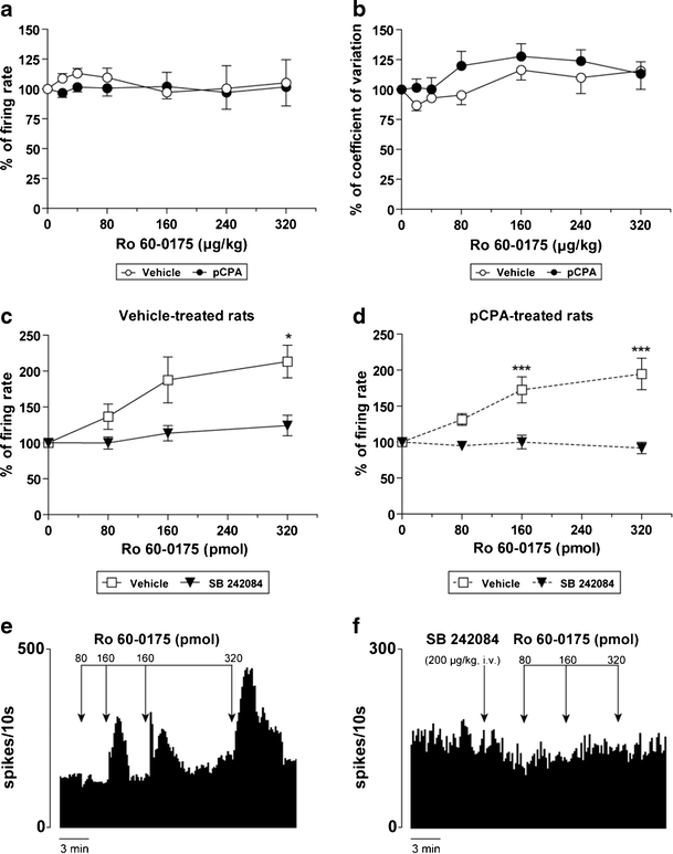 Effect of Ro 60-0175 on STN neuron activity. Intravenous administration of Ro 60-0175 (20–320 μg/kg) did not induce any effect on the firing rate (a) or on the coefficient of variation (b) either in pCPA- (300 mg/kg/day, i.p. 3 days; black circle; n = 8 neurons from eight rats) or vehicle-treated rats (white circle; n = 6 neurons from six rats). c When Ro 60-0175 (80–320 pmol) was locally applied into the STN (white square; n = 11 neurons from five vehicle-control rats) a stimulatory effect was induced. The systemic administration of SB 242084 (0.2 mg/kg, i.v.) prior to the local application of Ro 60-0175 blocked the stimulatory effect of the 5-HT2C receptor agonist (black triangle; n = 14 neurons from 14 vehicle-control rats). d Ro 60-0175 locally applied into the STN of pCPA-treated animals (white square; n = 36 neurons from seven pCPA-treated rats) caused a stimulatory effect. The systemic administration of SB 242084 (0.2 mg/kg, i.v.) prior to the local application of Ro 60-0175 blocked the stimulatory effect of the 5-HT2C receptor agonist (black triangle; n = 7 neurons from seven pCPA-treated rats). e Representative firing rate histogram illustrating the stimulatory effect of local administration of Ro 60-0175 on STN neuronal activity. f Representative firing rate histogram illustrating SB 242084 induced blockage of the stimulatory effect of local administration of Ro 60-0175 on STN neuron activity. *p < 0.05 and ***p < 0.001 vs. basal firing rate (Bonferroni’s post hoc test)