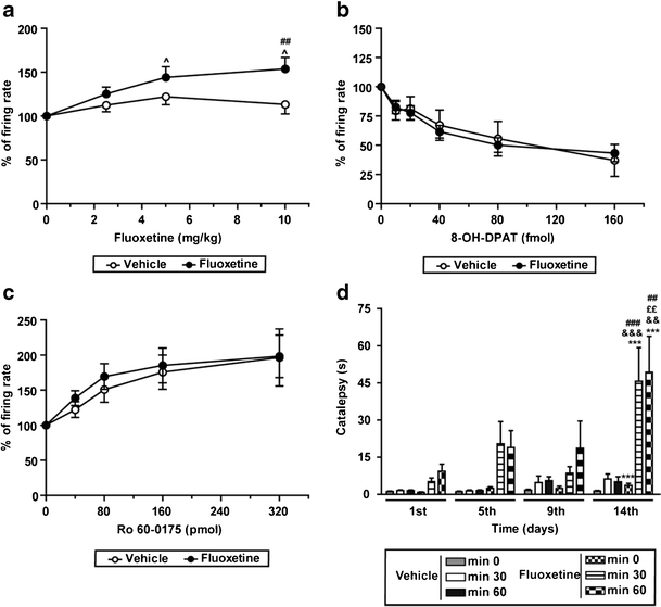 Effect of fluoxetine on STN neuron activity and motor behavior in vehicle- and chronic fluoxetine-treated (10 mg/kg/day, i.p. 14 days) rats. a Cumulative doses of fluoxetine (2.5–10 mg/kg, i.v.) induced an increase in the firing rate in fluoxetine-treated rats (black circle; n = 8 neurons from eight fluoxetine-treated rats), but not in the vehicle-treated rats (white circle; n = 14 neurons from 14 vehicle-treated control rats). The fluoxetine treatment did not modify the inhibitory (b) and the excitatory (c) effects induced by the local application of 8-OH-DPAT (20–160 fmol) or Ro 60-0175 (40–320 pmol) into the STN, respectively. d Fluoxetine chronic administration induced catalepsy on day 14 after the beginning of the treatment. Note that no catalepsy was observed before fluoxetine administration or at any time in the vehicle-treated group. Eight animals were included in each group. ^p < 0.05 vs. basal firing rate; ## p < 0.01 and ### p < 0.001 vs. respective vehicle-treated group; ***p < 0.001 vs. respective first day; ££ p < 0.01 vs. respective fifth day; &&p < 0.01 and &&&p < 0.001 vs. respective ninth day (Bonferroni’s post hoc test)