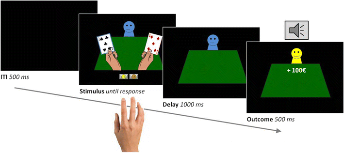 Sample trial of the reversal learning task. On each trial, participants were presented with two gambling cards. One of the cards was selected by computer and highlighted. Participants then had to predict, with a left or right button press, whether the card would be followed by a reward (a smiling emoticon, +100€ sign, and a high-pitch tone) or punishment (a sad emoticon, −100€ sign, and a low-pitch tone). After a short delay, the outcome was presented. The card-outcome associations were deterministic, and reversed after five to nine correct responses