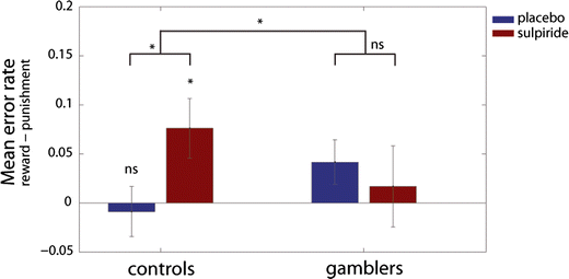 The effect of sulpiride on outcome-specific error rates (i.e., mean error rates on trials following unexpected rewards—mean error rates on trials following unexpected punishment). Sulpiride significantly impairs reward versus punishment learning in controls while not altering the balance between reward and punishment learning in gamblers. Error bars represent 1 SEM; *p < 0.05, ns denotes not significant