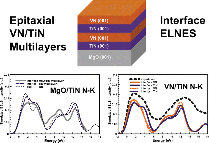 We study N-K-edge electron energy-loss near-edge structures for well-defined TiN/VN bilayers grown on a MgO(100) substrate by both calculations and experiments. The structural relaxations and the electronic structure of TiN/VN multilayers are calculated using the Vienna Ab Initio Simulation Package computer code, which uses density functional theory to describe the electronic interaction. The effects of the core hole created in the excitation process are included in the calculations. For VN, off-stoichiometric effects due to nitrogen vacancies are modelled. The partial density of states (PDOS) for the N-K edge of atoms in the vicinity of the TiN/MgO interface revealed that two new peaks appear between 7 and 9 eV instead of a broad shoulder typical for the bulk. For the VN/TiN interface, the PDOS is modified only slightly, owing to similar bonding on both sides of the interface, and is thus very similar to the respective bulk spectra. An experimental spectrum taken at the VN/TiN interface is, however, well described by an average of the simulated spectra for VN and TiN bulk (interface). Such a finding is characteristic of an intermixed interface.
