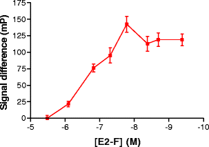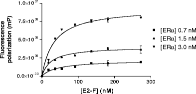 To test whether the newly synthesized E2-F had affinity for the ERα, a competitive binding curve for E2-F and ERα LBD was constructed (data not shown) using the coumestrol-based microplate reader assay described by Gurer-Orhan et al. [6]. E2-F was able to displace coumestrol from the ERα binding site, resulting in an IC50 value of 28.2 nM. This value is consistent with K D values found for similar tracers, which were also in the nanomolar range [7, 19]. Therefore, we concluded that the synthesized E2-F had affinity for the ERα and could be used to further develop a FP-based microplate reader assay.