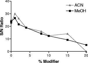 Effect of MeOH and ACN reaction coil concentrations upon the assay performance in FIA mode. The S/N ratios of the E2 injections equalling 100% tracer displacement are displayed
