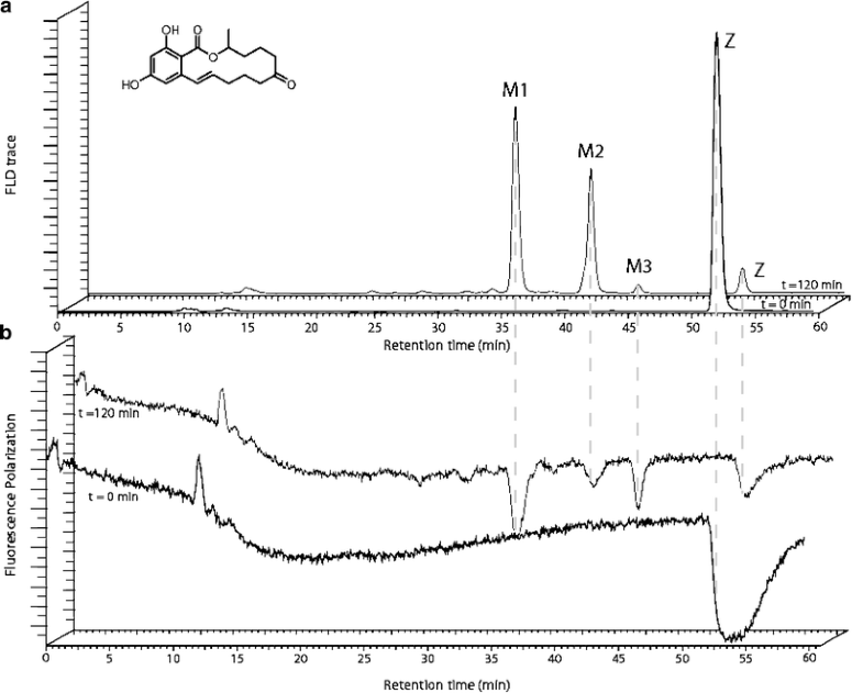a HPLC FLD chromatograms of zearalenone (Z) incubated for 0 and 120 min with PB-induced rat liver microsomes. M1, M2 and M3 are metabolites formed during the 120-min incubation period. b The corresponding ERα FP affinity traces. The structure of zearalenone is depicted in the figure