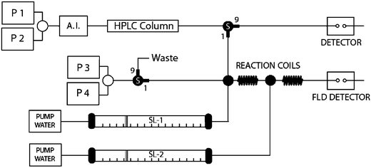 Schematic overview of the ERα fluorescence polarization receptor affinity detection (RAD) system in high-resolution screening (HRS) mode. Samples are injected with an autoinjector (A.I.) and are separated using a gradient reversed-phase high-performance liquid chromatography (HPLC) system controlled by P1 and P2, HPLC gradient pumps. After the column the flow is split by a flow spitter, S (split ratio 1:9). HPLC elution is monitored by UV or fluorescence detection. A makeup gradient, controlled by makeup gradient pumps P3 and P4, is introduced and eluting compounds are mixed in the first reaction coil with ERα delivered by superloop-1 (SL-1). In the second reaction coil, the probe ligand E2-F is added to the mix by superloop-2 (SL-2). ERα affinity detection is performed using a fluorescence detector (FLD). In FIA mode the samples are delivered directly by a carrier solution into the bioassay