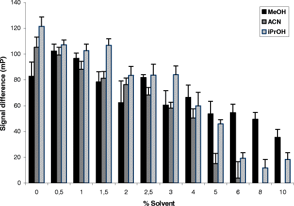 FP-based microplate reader solvent optimization. Incubations in the presence of ERα ligand E2 (33.3 μM; equal to 100 % tracer displacement) were compared with incubations without E2 (equal to 0% displacement) at increasing MeOH, ACN and iPrOH concentrations at an E2-F concentration of 83.3 nM