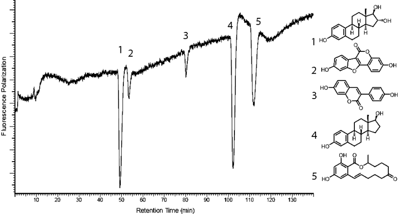 ERα FP RAD trace of a mixture of five estrogenic compounds injected into the ERα FP RAD HPLC system (injected compounds are as follows: estriol (1) [3.75 nmol; 49.5 min], coumestrol (2) [3.75 nmol; 53.7 min], coumarol (3) [37.5 nmol; 80.4 min], 17β-estradiol (4) [3.75 nmol; 102.8 min] and zearalenone (5) [12.5 nmol; 112.5 min]