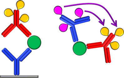 Two representative immunoassay formats—a heterogeneous sandwich immunoassay (left) and a homogeneous immunoassay based on LRET between two luminescent labels (indicated by purple arrow; right). Antibodies labeled with tags (teardrop) are used for detection of antigens (circles)