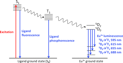 Luminescence emission processes of a general europium chelate. An antenna ligand absorbs the excitation energy and transfers it to the T1 level via intersystem crossing, from which it is transferred to the chelated Eu3+ and emitted via several transitions