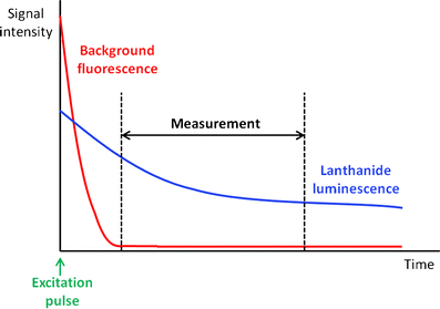 In the field of lanthanide-based time-resolved luminescence (TRL) immunoassays, the most common solid phases are microtitre plates. This has the practical advantage in terms of instrumentation that TRL capability can be incorporated into luminescence plate readers that are also capable of measuring other luminescence phenomena, for example fluorescence polarization or chemiluminescence. This provides a convenient and cost-effective measurement solution for the end user. A number of different plate readers with TRL measurement modes exist today. They vary in respect of the type of excitation sources, filters and/or monochromators, time-gating, and focus setups used. Excitation sources can be either flash lamps, lasers or UV-LEDs, although combinations of excitation sources (flash lamp plus UV-LED) do exist in some instruments in order to combine sensitivity with high flexibility (e.g. SpectraMax Paradigm, Molecular Devices). In particular, the strong 337 nm emission of a nitrogen laser is suitable for most europium chelates. Depending on the excitation source, instruments are either filter-based or monochromator-based. Whereas filter-based devices are generally regarded as more sensitive, they are not as flexible as monochromator-based devices (e.g. the Infinite m1000 system from Tecan). The time-delayed detection of the fluorescence signal is normally achieved by oscillator-controlled electronic devices. The strategy here is to ignore photon counts which arrive at the detector before a specific timepoint. A general challenge in TRL readers is the need for photomultiplier tubes with exceptionally low dark count rates. This is because the photon output of lanthanide-based TRL dyes is generally low compared with that of conventional fluorophores. With the recent development of various lanthanide based immunoassays as described below, more and more TRL-capable plate readers are becoming commercially available and more users are equipped to perform the assays described below.
