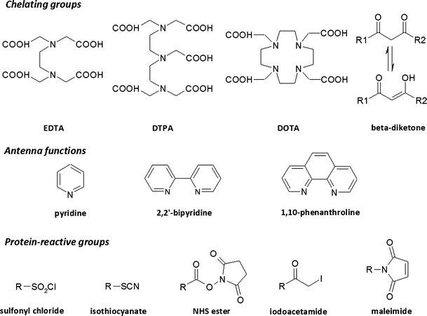 The use of lanthanide ions in immunoassays requires their incorporation into the immunocomplex. This is achieved via the use of chelating agents, either by direct labeling of antibodies or by indirect labeling of secondary detection reagents. One secondary detection reagent is streptavidin, which can then be used with readily available biotinylated antibodies. A lanthanide chelator for use in immunoassays therefore consists of at least two parts—a chelating group for binding the lanthanide ion and some functionality for attachment to biomolecules. When the lanthanide-labeled biomolecule must be intrinsically luminescent, an additional sensitizing antenna moiety is required (as described in the section “Lanthanide luminescence”). The need to integrate the optimum requirements of each of these three components into a single molecule—that is, to create a stable complex which combines efficient light absorption, energy transfer, and emission, and which can be conveniently attached to biomolecules without interfering with their activity—is a major challenge in this field of research and the key points will be introduced in the section “Ligand requirements”. Numerous examples of specific lanthanide chelates from several structural classes will then be introduced in the sections “Non-luminescent chelates”, “PAC-based luminescent chelates”, “β-Diketone-based luminescent chelates”, and “Other luminescent chelates”). The focus here will be on chelating structures that have been applied or have the potential to be applied to immunoassays rather than those designed for, e.g., electroluminescent materials applications, which have been excellently reviewed elsewhere [7].