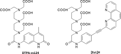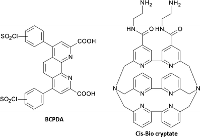 The Cis-Bio cryptate (Fig. 8) is a macropolycyclic ligand containing three bipyridine ligands with a dual chelator–antenna function, forming a cavity which is able to encapsulate Eu3+ and Tb3+ ions to form luminescent complexes [14]. Although this cavity results in tight metal chelation, the limitations of this system include the fact that addition of relatively large amounts of fluoride ions is necessary to exclude water molecules, and the excitation wavelength (307 nm) is somewhat shorter than desired. Nevertheless, europium complexes have found application as donors in homogeneous assays, for example the time-resolved amplification of cryptate emission (TRACE) and homogeneous time-resolved fluorescence (HTRF) assays from CisBio (described in the section “Homogeneous assays”) [45, 46, 47].