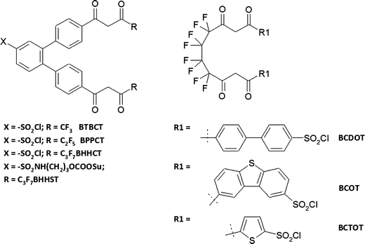 β-diketonate-based lanthanide chelating agents. Abbreviations: BTBCT, 4,4′-bis(1″,1″,1″-trifluoro-2″,4″-butanedion-4″-yl)-chlorosulfo-o-terphenyl; BPPCT, 4,4′-bis(1″,1″,1″,2″,2″-pentafluoro-3″,5″-pentanedion-5″-yl)-chlorosulfo-o-terphenyl; BHHCT, 4,4′-bis(1″,1″,1″,2″,2″,3″,3″-heptafluoro-4″,6″-hexanedion-6″-yl)-chlorosulfo-o-terphenyl; BHHST, 4,4′-bis(1″,1″,1″,2″,2″,3″,3″-heptafluoro-4″,6″-hexanedion-6″-yl)-sulfonylaminopropyl ester-N-succinimide ester-o-terphenyl; BCDOT, 1,10-bis(4″-chlorosulfo-1,1″-diphenyl-4′-yl)-4,4,5,5,6,6,7,7,-octafluorodecane-1,3,8,10-tetraone; BCOT, 1,10-bis(8′-chlorosulfodibenzothiophene-2′-yl)-4,4,5,5,6,6,7,7,-octafluorodecane-1,3,8,10-tetraone; BCTOT, 1,10-bis(5′-chlorosulfothiophene-2′-yl)-4,4,5,5,6,6,7,7,-octafluorodecane-1,3,8,10-tetraone