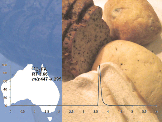 An ultra-performance liquid chromatography-tandem mass spectrometry method was developed, optimised and validated for the quantification of synthetic folic acid (FA), also called pteroyl-l-glutamic acid or vitamin B9 and naturally occurring 5-methyltetrahydrofolate (5-MTHF) found in folate-fortified breads. Optimised sample preparation prior to analysis involved addition of 13C5 labelled internal standards, treatments with α-amylase and rat serum, solid-phase extraction using aromatic-selective cartridges and ultra-filtration. Analytes were separated on a Waters ACQUITY HSS T3 column during a 6-min run and analysed by positive ion electrospray selected reaction monitoring MS/MS. Standard calibration curves for the two analytes were linear over the range of 0.018–14 μg FA/g of fresh bread (r 2 = 0.997) and 9.3–900 ng 5-MTHF/g of fresh bread (r 2 = 0.999). The absolute recoveries were 90% and 76% for FA and 5-MTHF, respectively. Intra-day coefficients of variation were 3% for FA and 18% for 5-MTHF. The limit of detection was 9.0 ng/g for FA and 4.3 ng/g for 5-MTHF, determined using pre-extracted tapioca starch as the blank matrix. The assay is rugged, fast, accurate and sensitive, applicable to a variety of food matrices and is capable of the detection and quantification of the naturally occurring low levels of 5-MTHF in wheat breads. The findings of this study revealed that the FA range in Australian fortified breads was 79–110 μg/100 g of fresh bread and suggest that the flour may not have the mandated FA fortification level (200–300 μg/100 g of flour), though this cannot be determined conclusively from experimental bread data alone, as variable baking losses have been documented by other authors.