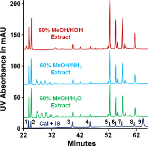 LCUV chromatograms for different extraction solvents