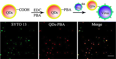 Initially, the 3-amino-phenylboronic acid (APBA) reacted with QDs-COOH to prepare the PBA capped QDs (QDs-PBA). Then, the vesicular stomatitis virus (VSV), on which the surface of the envelope is abundant with sialic acid (SA), could be labeled efficiently and specifically with QDs-PBA in one step based on sialic acid-phenylboronic acid recognition system. The labeling efficiency attained to (83 ± 4.3 %) (mean ± SD). The labeled VSA (QDs-VSV) was still infectious and capable of being imaged at the single virion level