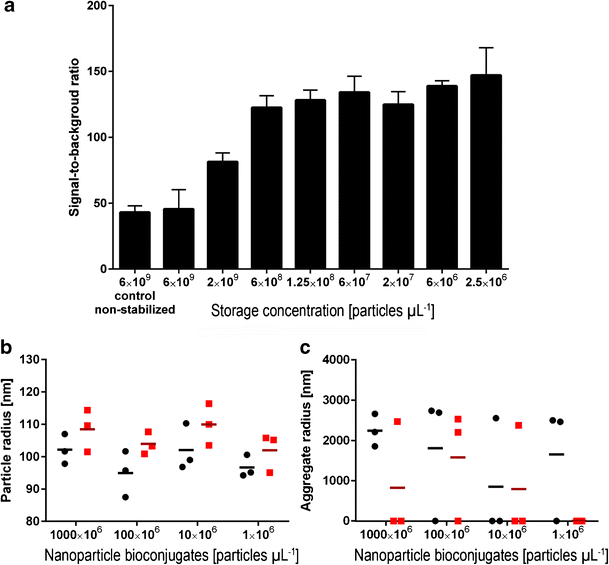 Concentration-dependent protein corona stabilization. a The nanoparticle bioconjugates were stored in KVG buffer at various concentrations and then used to perform a one-step assay for 100 μU L−1 TSH in KVG buffer assay matrix. Dilution to the assay concentration (2.5 × 106 particles μL−1) was made in a single step. Stabilization of the particle suspension was achieved up to a concentration 100-fold higher than the concentration used in the assay. Mean values of three replicates are presented as bars and standard deviation as error bars. b Main peak of a DLS measurement of nanoparticle bioconjugates diluted into KVG buffer measured immediately after dilution, sonication, and vortexing (black circles, black line represents a mean of 3 replicates) and one measured after dilution, 24 h stabilization, sonication, and vortexing (red squares, deep red line represents a mean of 3 replicates). c Representation of the aggregate peak of the same DLS measurement; while we observed aggregates only in some of the samples, typically the aggregates were fewer and smaller in the stabilized samples. A zero value indicates that the amount of aggregates in the sample fell below the detection limit
