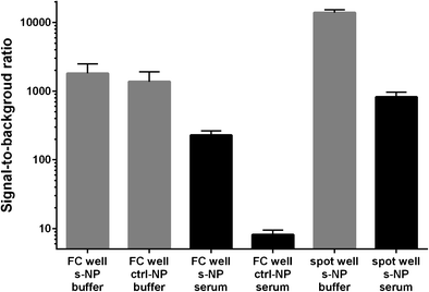 Comparison of TSH assay signal-to-background ratios in KVG buffer (buffer, gray bars) and in 50% affinity-purified serum (serum, black bars). TSH concentration was 100 μU L−1; mean values of three replicates are presented as bars and standard deviation as error bars. The assay utilized normal (ctrl-NP) and protein corona-stabilized nanoparticle bioconjugates (s-NP) and fully coated (FC) and spot-coated (spot) microtiter wells. The optimized configuration gave 10-fold higher signal-to-background ratio in KVG buffer configuration with fully coated well and control NPs and a 100-fold higher ratio in 50% affinity-purified serum configuration with fully coated well and control NPs