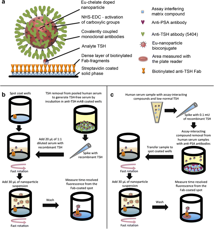 Schema and flow diagram of the assay concept. a Sandwich complex. Carboxyl groups on Eu-doped polystyrene nanoparticles are functionalized with EDC-NHS (treatment to generate succinimidyl groups). Then the particles are coated with monoclonal anti-TSH antibodies to form the nanoparticle bioconjugates and unreacted succinimidyl groups are converted back to carboxylic acid through hydrolysis. The solid phase is first coated with streptavidin and blocked with BSA; subsequently, an area of approximately 1 mm2 is functionalized with anti-TSH Fab fragments recognizing a different epitope in TSH than the nanoparticle-conjugated antibodies. b To optimize the assay we needed TSH-free human serum and we produced it by affinity purification of pooled human serum. For the purification we used 2 × 10 min incubation of the serum in anti-TSH-coated microtiter wells, after which we spiked samples with known concentrations of recombinant human TSH. The TSH was added to serum into equal volume of KVG buffer, and 20 μL of this mixture was added to spot-coated wells. After 10 min incubation with fast circular mixing the nanoparticle bioconjugates were added in a volume of 30 μL and incubation was continued for 30 min. Subsequently, unbound nanoparticle bioconjugates were washed away, and wells were read for time-resolved Eu-fluorescence. c To reduce nonspecific binding in a nanoparticle-based immunoassay we used a nonspecific affinity purification step to remove compounds interfering with the assay. First, a sample of female serum low–normal range TSH sample was spiked with 100 μU L−1 of TSH in KVG buffer (Fig. 4) and incubated for 2 × 10 min in anti-PSA Fab-coated wells (women do not have PSA in circulation so nothing specific is removed). A replicate sample was spiked, but left untreated. 20 μL of both samples were transferred to spot-coated wells and assayed like in protocol b. Difference in TSH-assay performance is presented in Fig. 4
